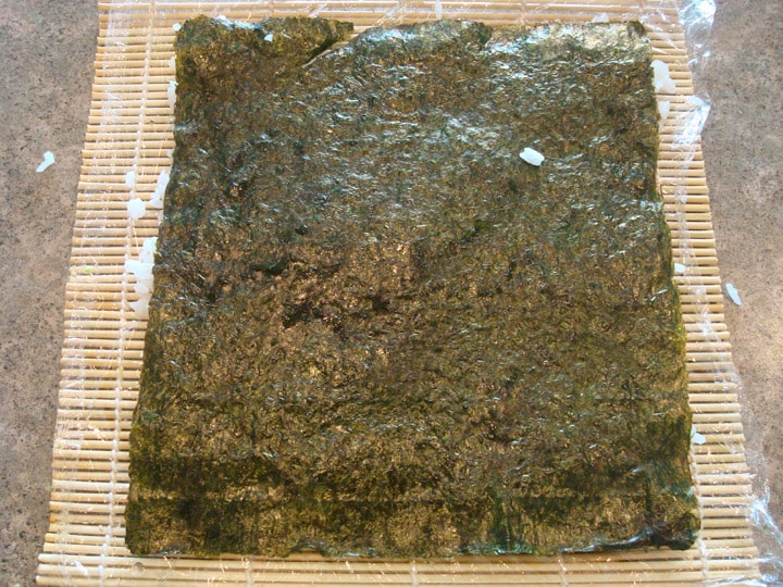 Now flip your bamboo mat back over and take a piece of that deliciously dark nori and place it on the top of the bamboo mat.