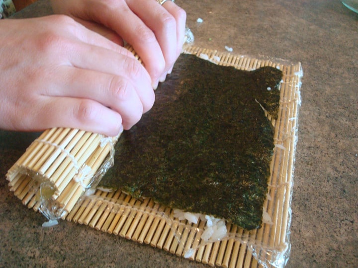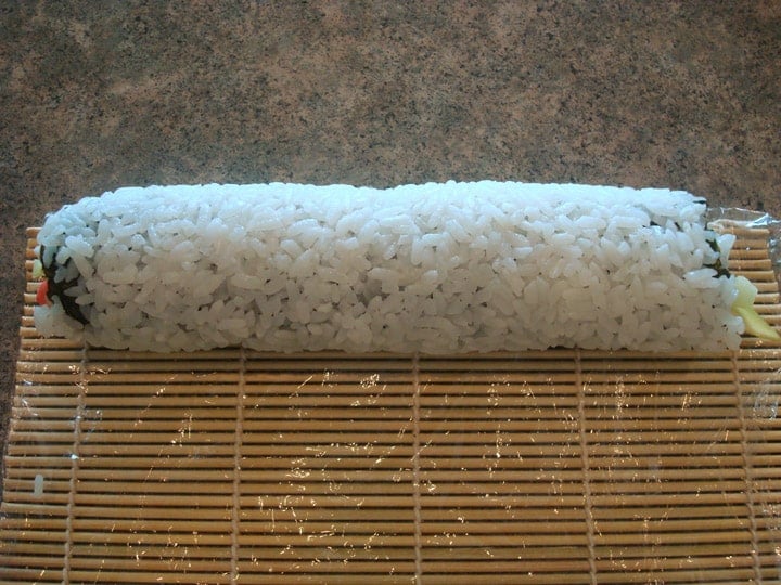 As you do this, the bamboo mat will have some overhang in front of your fingers, but that’s the sign that your California Roll is rolling up nice and tight.