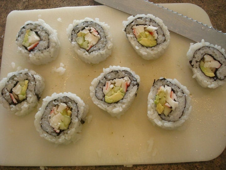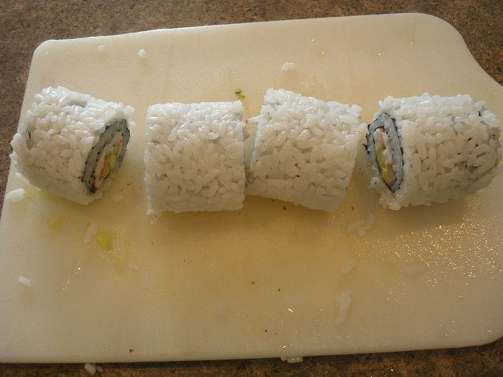 Then eighths – you get the picture. And have I mentioned…try not to stuff your face full of the California Rolls – I still need to show you how to roll it up with the nori on the outside.
