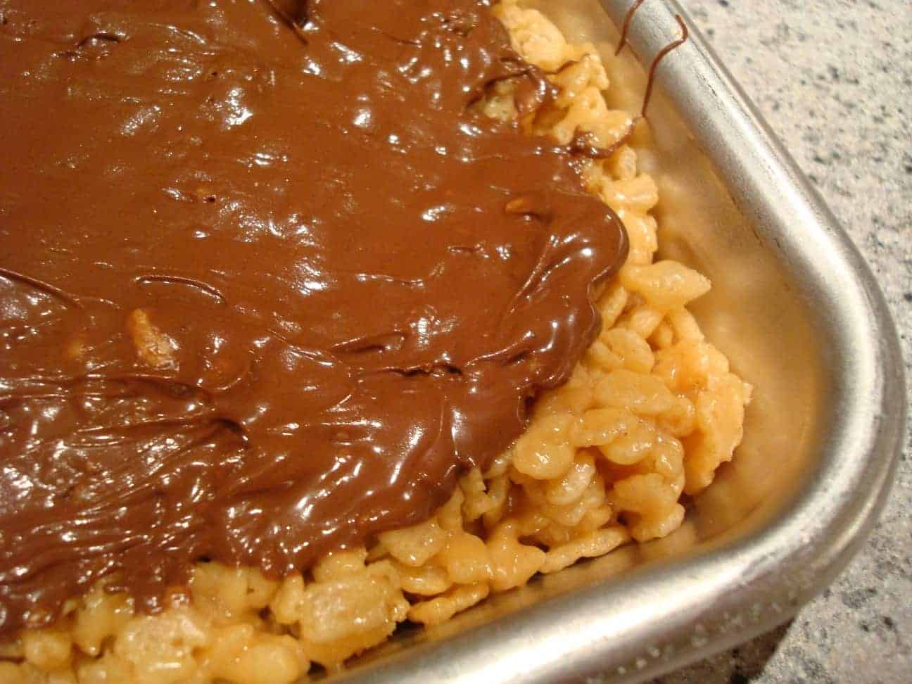 - Spread chips on top of rice krispie mixture. Let chocolate set. Cut into squares and really, try to share a few before you eat the entire batch!