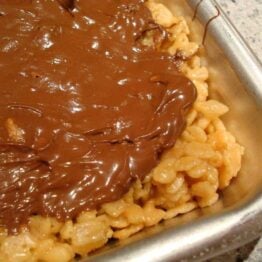 • Spread chips on top of rice krispie mixture. Let chocolate set. Cut into squares and really, try to share a few before you eat the entire batch!