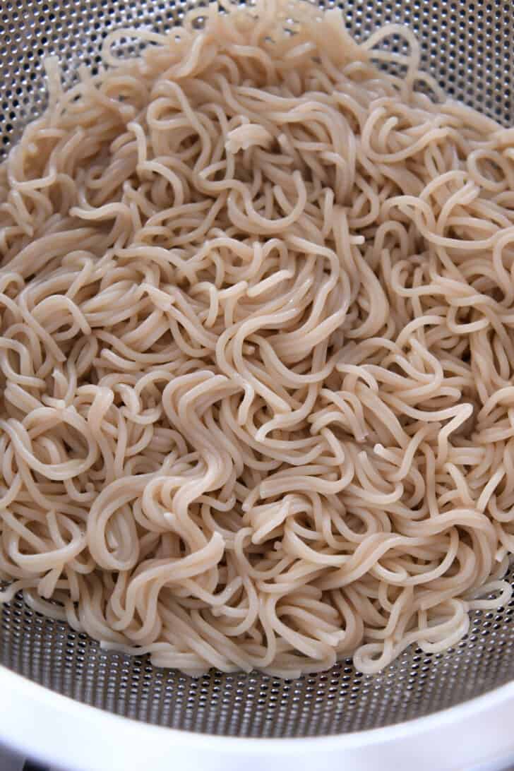Every day ramen noodles – you know, the kind in plastic packages with powdered seasoning packets stored in plentiful rows at the grocery store – work great in this recipe. Just toss the seasoning packets and boil the noodles according to package directions.