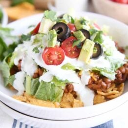 I’m not sure why, but we far prefer corn chips for this recipe, although you can definitely use tortilla chips if that’s your thing or what you have on hand.