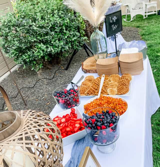 The night of, we mixed the wet ingredients with the dry for the waffles and had a couple waffle iron stations set up on different circuits. We started cooking the waffle about 45 minutes before the reception started and kept the waffles warm and semi-crisp set on cooling racks in a warm oven. We separated the larger circle waffles into quarters, and we also used an adorable heart-shaped waffle maker {aff. link} and a small circle waffle maker {aff. link}.