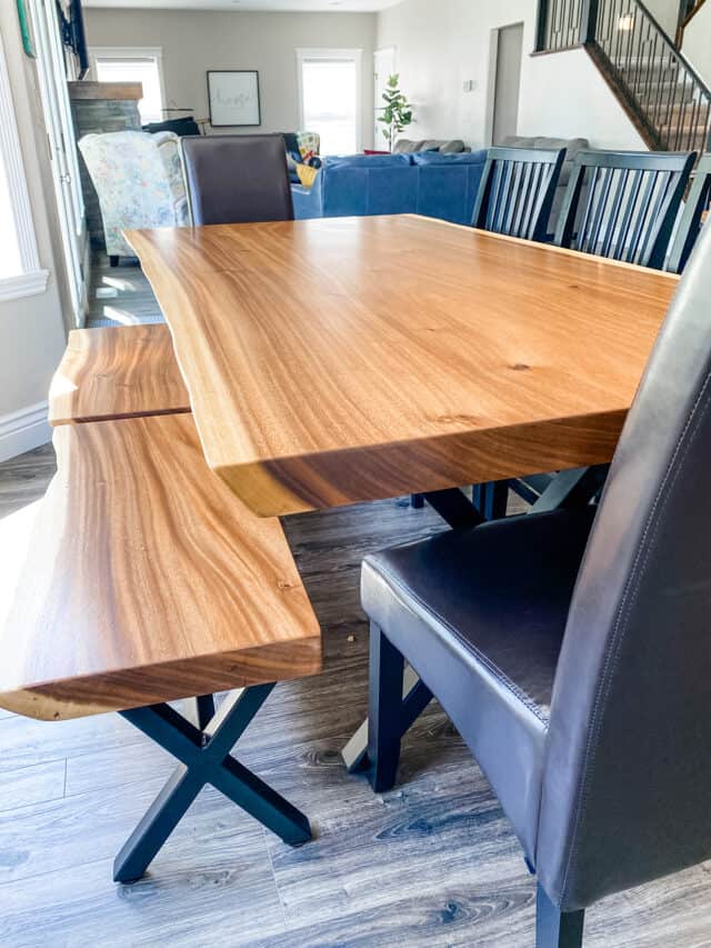 Long story short, I went to Impact Imports rustic showroom, fell in love, convinced Brian it was the right thing to do (or rather, told him he didn’t really get a vote), and six weeks later, our new baby, er, I mean, kitchen table was delivered. They were able to use the top part of the slab to make two benches for one side of the table, and I grabbed the other chairs off Amazon (not the highest quality chairs, but totally functional right now).