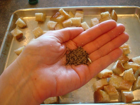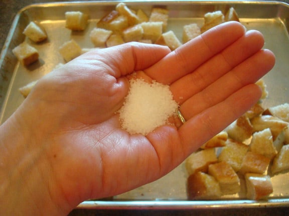 handful of coarse salt over a pan of bread cubes