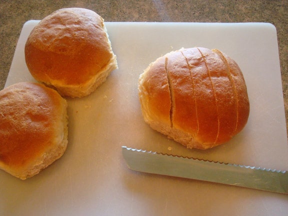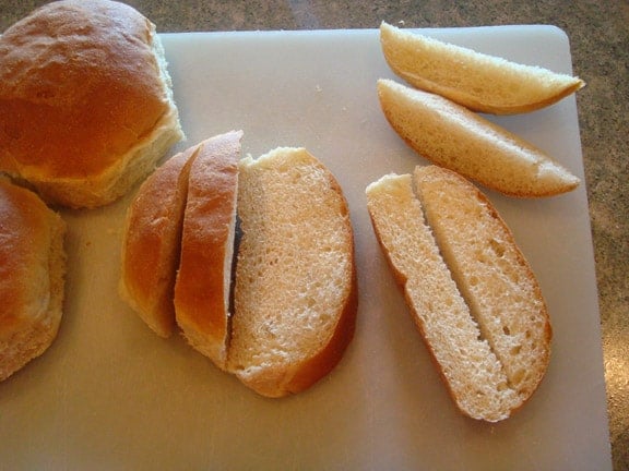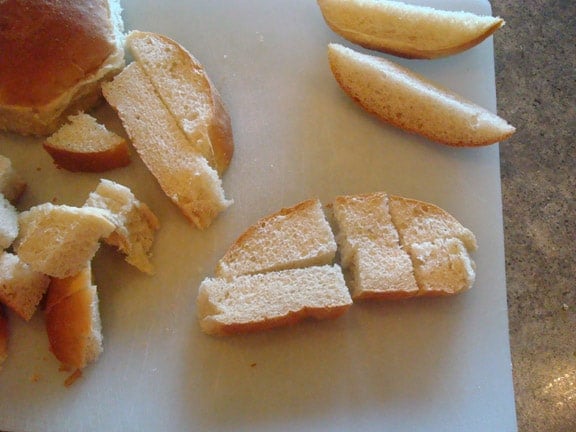 For today’s purpose, I am using some homemade buns I used with this recipe (subbing whole wheat for half the flour). Start by cutting them into about 1/2-inch strips.rolls on a white cutting board being cut into 1/2 inch strips