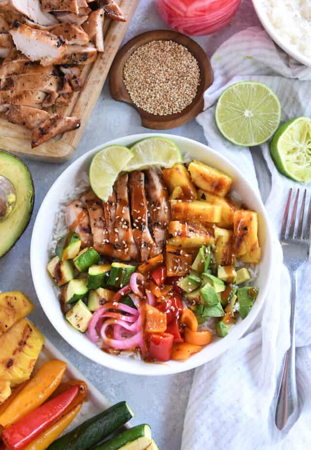 - Add a scoop of rice to a serving plate or bowl followed by chicken slices, pineapple, bell peppers, zucchini, and any other add-ins like diced avocados, red onion slices, fresh lime wedges.