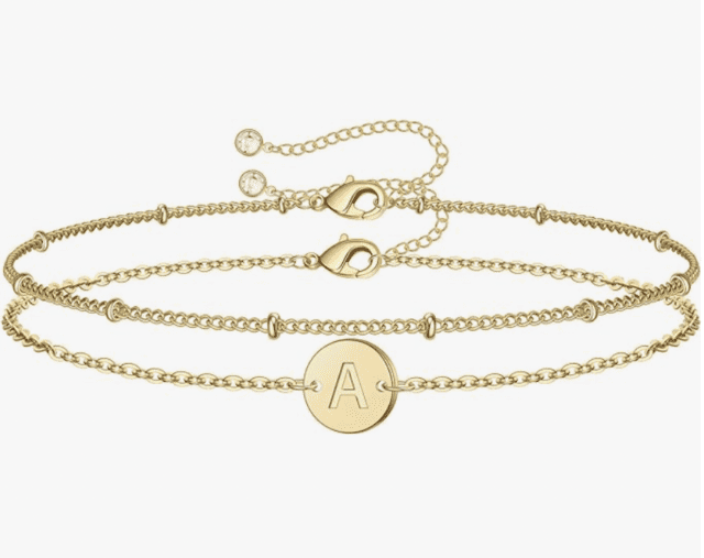 Gold Initials Bracelet: layered bracelets are so popular, and I love that this bracelet is in two separate strands (no tangling!). It fits small wrists, too…just makes the end chain a bit longer.