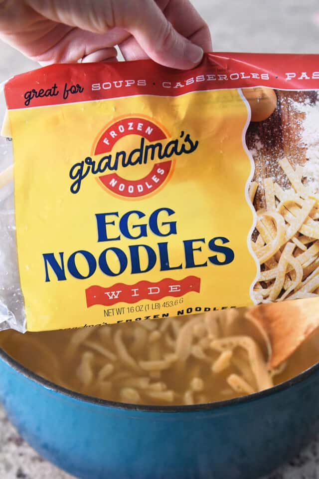 To help amplify the homestyle taste and consistency, the best kind of noodles to use for this soup are frozen egg noodles. Two popular brands are Grandma’s and Reames. I can easily find them in the freezer section of my local grocery store next to bread dough/rolls (I’ve also seen them at Albertsons, Walmart, and many other stores).