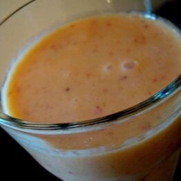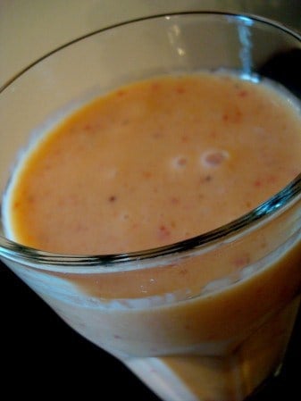 This is my take on a traditional Indian drink: a mango lassi. Creamy, light, fruity – this better-than-a-smoothie concoction is absolutely delicious and I make it every time I find ripe mangoes at a good price.