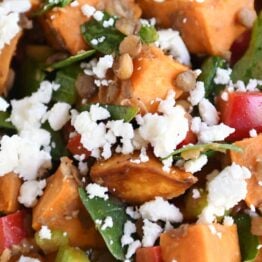 This roasted sweet potato lentil salad is next level delicious! It might look unassuming, but it is incredible and so easy to make!