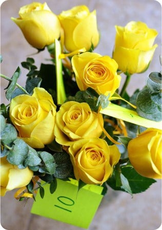 This past week, Brian and I celebrated our 10 year anniversary. Since the 10 year anniversary classically symbolizes sushi (huh, you didn’t know that? strange…), we celebrated by eating ourselves sick on delicious, take-out sushi for dinner while the boys gorged themselves on waffles. Candlelight sushi and waffle dinner, of course. That’s what 10 years does to you…you celebrate the anniversary family-style and love every minute of it. Brian sent me these beautiful flowers during the day – 10 yellow roses (my favorite color and the same flower in my wedding bouquet) each tied with a handwritten note of a milestone we’ve reached together in our 10 years. I bawled like a baby. It was so sweet and made me feel a little sheepish that all I gave him was a homemade card with a simple tagline on the front about kids and cake (this section of this post has been updated; I previously posted exactly what the card said on the front but it hurt many of your feelings and so I’ve deleted the specifics – it was never my intention to offend anyone and I’m sorry if I did!).