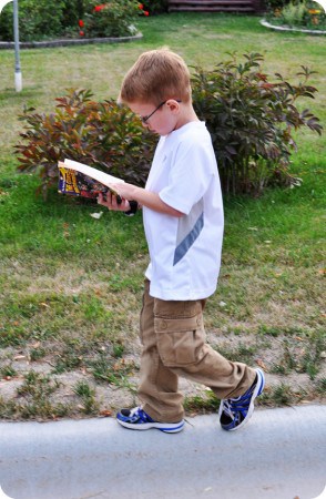 3) Thanks to the book recommendations, my 1st grader (aptly named Walker) won’t even put his book down for a Sunday afternoon family walk. Reading and walking (on a curb, no less). Pretty impressive. Except that this photo was taken about 1.3 seconds before he biffed it. Hard. After the tears subsided, all he cared to know was what page he was on since the book closed during the epic fall and the walking and reading resumed right on cue. Love this little dude.