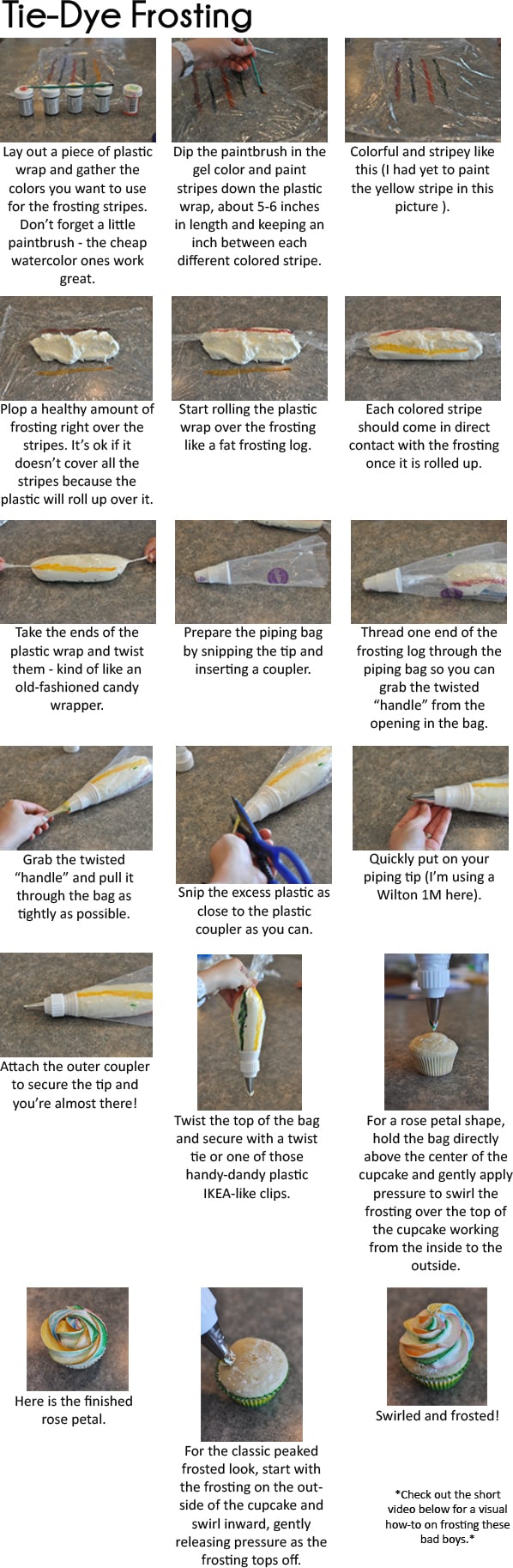 Speaking of frosting the cupcakes, here’s a short video showing a quick how-to on getting those beautiful swirls of frosting on top of the cupcake. Check out the step-by-step tutorial at the end of the post for the actual tie-dyed frosting info.