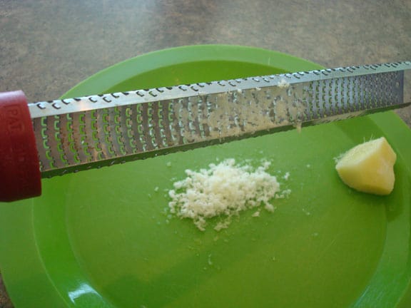 When I’m ready to grate it, I pull a knob of ginger out of the bag and get out my handy dandy rasp grater. Oh, how I love my rasp grater.